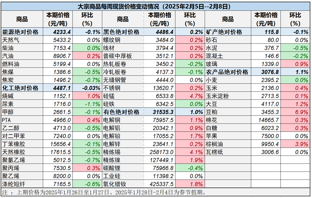 據(jù)中國(guó)物流與采購(gòu)聯(lián)合會(huì)對(duì)全國(guó)50種重要大宗商品市場(chǎng)價(jià)格調(diào)查顯示,本期價(jià)格(2025年2月5日至2月8日)與上期價(jià)格相比,24種(占比48%)價(jià)格上漲,17種(占比34%)大宗商品價(jià)格下跌,9種(占比18%)價(jià)格持平。