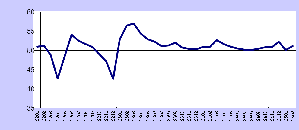 2022年1月-2025年2月綜合PMI產出指數走勢圖