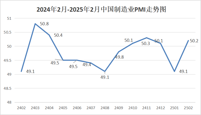 中國物流與采購聯合會、國家統計局服務業調查中心發布的2025年2月份中國制造業采購經理指數(PMI)為50.2%,比上月上升1.1個百分點。