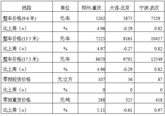 分車型看,各車型指數環比漲跌互現。其中,整車指數為1051.44點,比上周回升0.02%;零擔輕貨指數為1027.43點,比上周回落0.01%;零擔重貨指數為1052.11點,比上周回升0.02%。