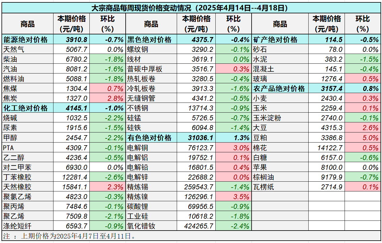 本表所示大宗商品價格(類別與產品規格說明見附表)為以人民幣計價的現貨價格(包含流通費用、利潤和稅費等)。計算這些價格時使用的信息來源,主要包括國內重點地區的生產商、貿易商及下游消費企業之間的成交、詢報盤及可成交價格。價格單位為人民幣元/噸。