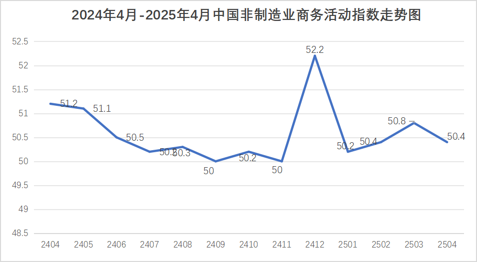 中國物流與采購聯合會、國家統計局服務業調查中心發布的2025年4月份中國非制造業商務活動指數為50.4%,環比下降0.4個百分點。由于非制造業沒有綜合指數,通常以商務活動指數來反映非制造業經濟的總體變化。