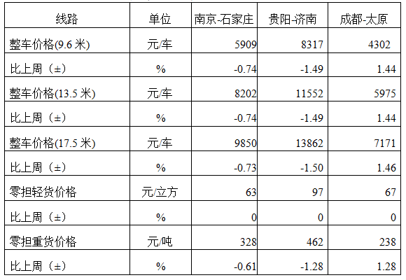 分車型看,各車型指數環比漲跌互現。其中,整車指數為1054.67點,比上周回落0.12%;零擔輕貨指數為1026.43點,比上周回落0.01%;零擔重貨指數為1055.75點,比上周回落0.30%。
