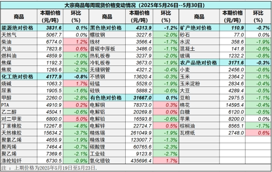本表所示大宗商品價格(類別與產品規格說明見附表)為以人民幣計價的現貨價格(包含流通費用、利潤和稅費等)。計算這些價格時使用的信息來源,主要包括國內重點地區的生產商、貿易商及下游消費企業之間的成交、詢報盤及可成交價格。價格單位為人民幣元/噸。