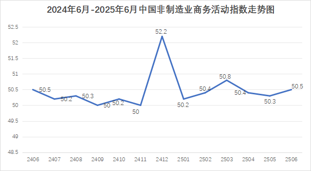 中國物流與采購聯合會、國家統計局服務業調查中心發布的2025年6月份中國非制造業商務活動指數為50.5%,環比上升0.2個百分點。由于非制造業沒有綜合指數,通常以商務活動指數來反映非制造業經濟的總體變化。