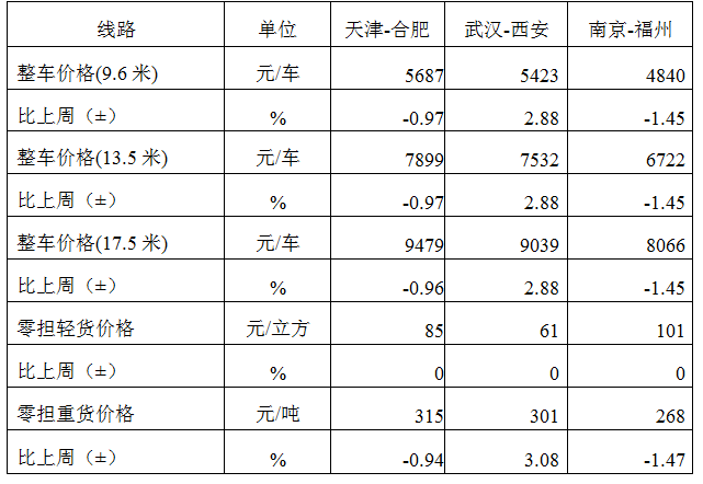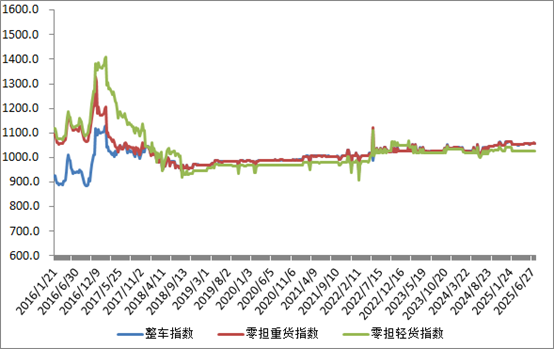 分車型看,各車型指數環比有所回落。其中,整車指數為1056.69點,比上周回落0.05%;零擔輕貨指數為1026.02點,比上周回落0.04%;零擔重貨指數為1056.37點,比上周回落0.28%。
