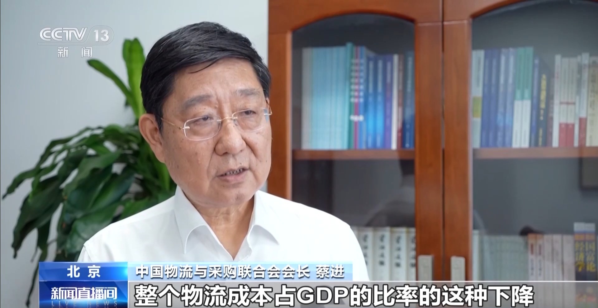 中國物流與采購聯合會會長 蔡進:整個物流成本占GDP的比率的下降,反映出來的就是物流效率的進一步提高。物流成本占GDP的比率,每下降0.1個百分點,意味著100萬億元的GDP能夠節省1000億元的物流成本。