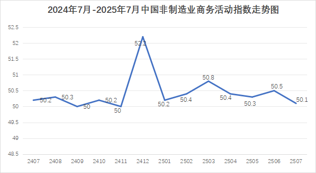 中國物流與采購聯合會、國家統計局服務業調查中心發布的2025年7月份中國非制造業商務活動指數為50.1%,環比下降0.4個百分點。由于非制造業沒有綜合指數,通常以商務活動指數來反映非制造業經濟的總體變化。