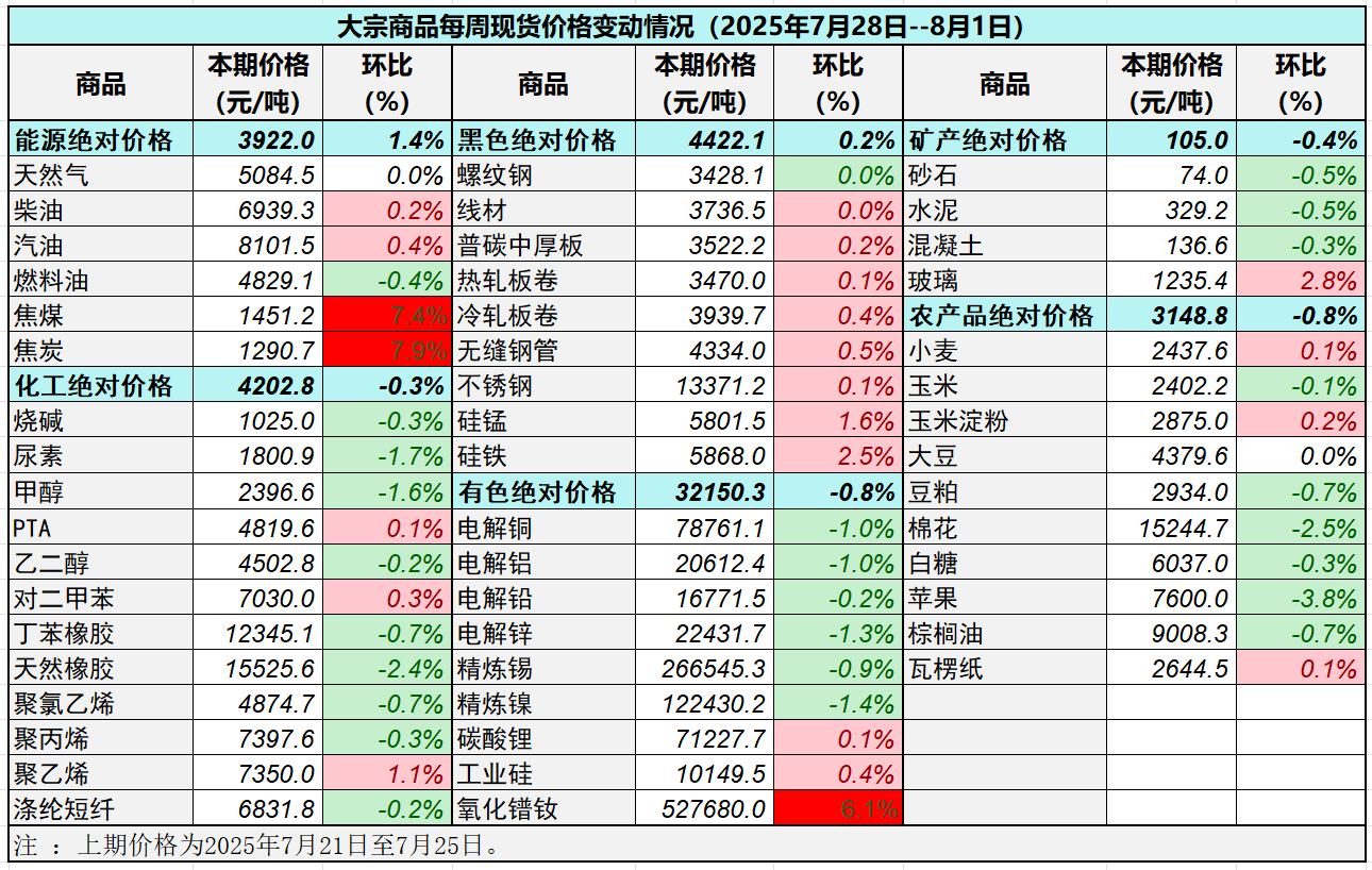 本表所示大宗商品價格(類別與產品規格說明見附表)為以人民幣計價的現貨價格(包含流通費用、利潤和稅費等)。計算這些價格時使用的信息來源,主要包括國內重點地區的生產商、貿易商及下游消費企業之間的成交、詢報盤及可成交價格。價格單位為人民幣元/噸。