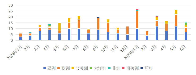今年2月以來,美國頻繁出臺多項關稅政策,對中美航線產生影響。2025年5月,新開中美航線僅有1條,同比降低83%。2025年6月,新開中美航線數量為2條,同比降低50%。