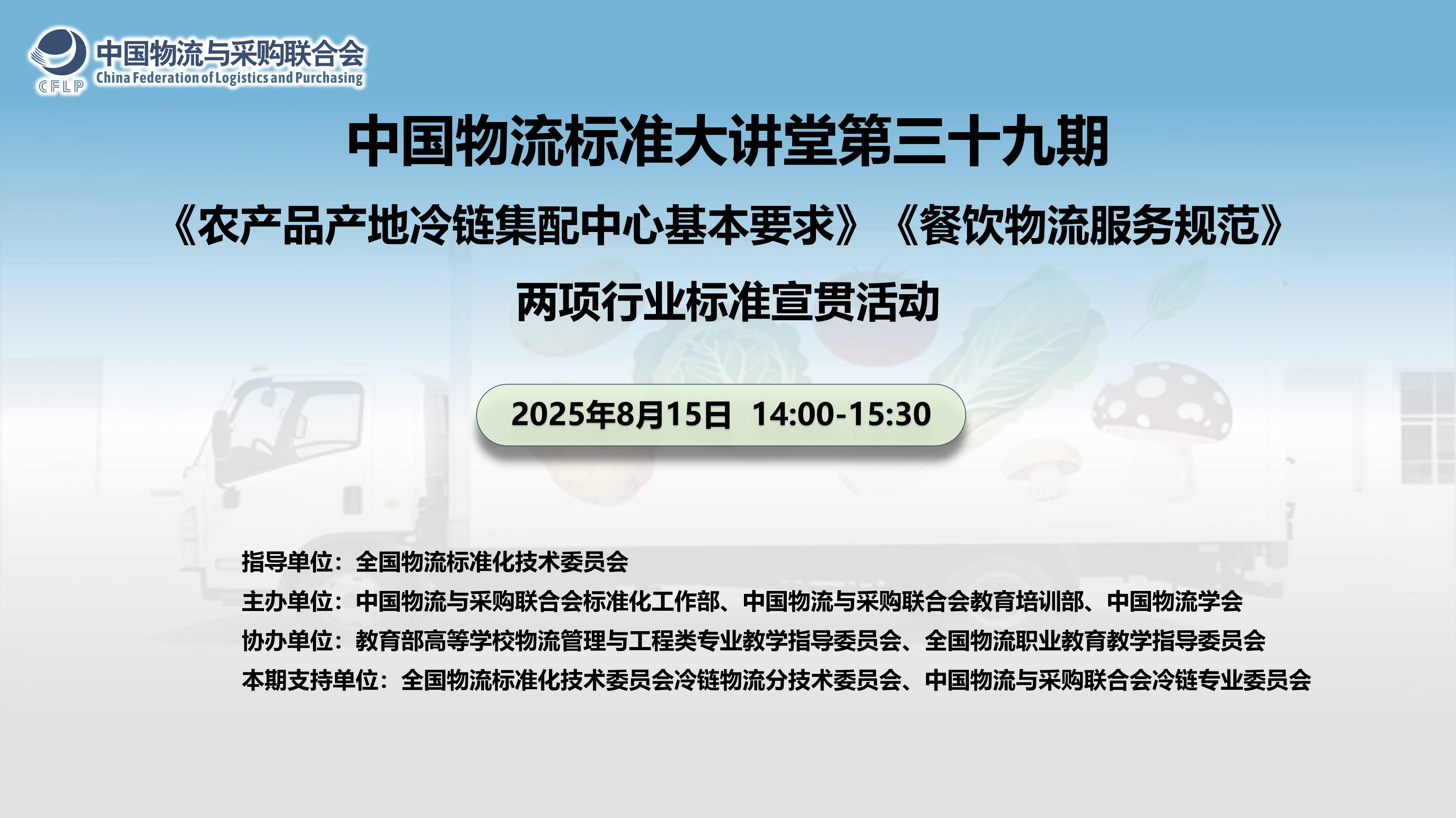 2025年8月15日,在全國物流標準化技術委員會的指導下,中國物流與采購聯合會標準化工作部和教育培訓部、中國物流學會共同主辦了“中國物流標準大講堂”第39期——《農產品產地冷鏈集配中心基本要求》(WB/T 1145-2024)和《餐飲物流服務規范》(WB/T 1054-2024)行業標準宣貫活動。本次活動共有2800余人次在線參加。