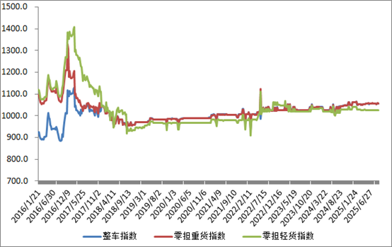 分車型看,各車型指數(shù)環(huán)比漲跌互現(xiàn)。其中,整車指數(shù)為1057.09點,比上周回落0.05%;零擔輕貨指數(shù)為1026.13點,比上周回升0.03%;零擔重貨指數(shù)為1056.78點,比上周回落0.17%。