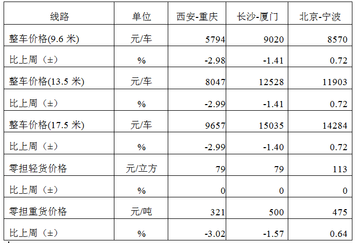 表1 本周部分線路平均價格及環(huán)比情況對比