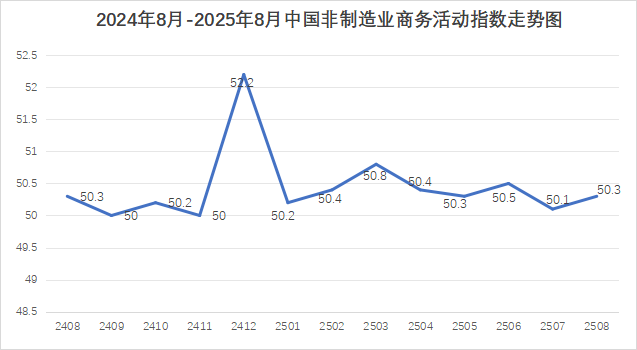 中國物流與采購聯合會、國家統計局服務業調查中心發布的2025年8月份中國非制造業商務活動指數為50.3%,環比上升0.2個百分點。由于非制造業沒有綜合指數,通常以商務活動指數來反映非制造業經濟的總體變化。