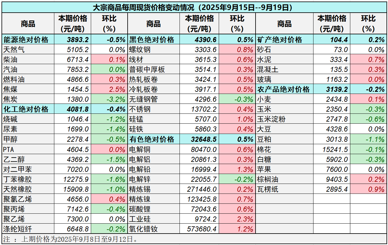 本表所示大宗商品價格(類別與產品規格說明見附表)為以人民幣計價的現貨價格(包含流通費用、利潤和稅費等)。計算這些價格時使用的信息來源,主要包括國內重點地區的生產商、貿易商及下游消費企業之間的成交、詢報盤及可成交價格。價格單位為人民幣元/噸。