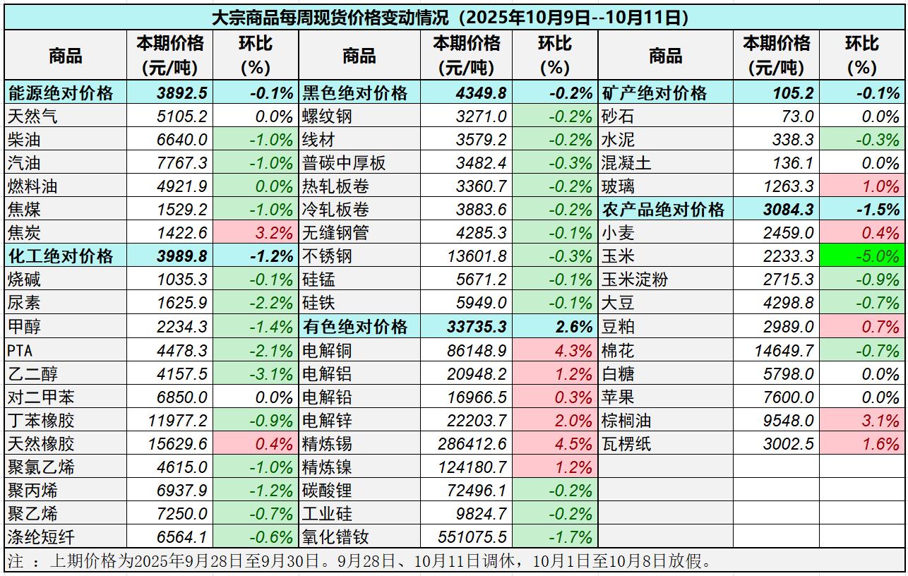 據(jù)中國物流與采購聯(lián)合會對全國50種重要大宗商品市場價格調(diào)查顯示,本期價格(2025年10月9日至10月11日)與上期價格相比,13種(占比26%)大宗商品價格上漲, 31種(占比62%)價格下跌, 6種(占比12%)價格持平。