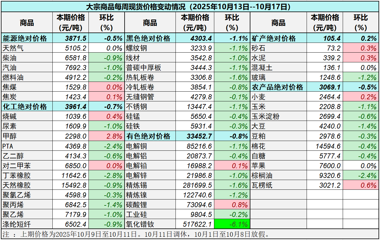 本表所示大宗商品價格(類別與產品規格說明見附表)為以人民幣計價的現貨價格(包含流通費用、利潤和稅費等)。計算這些價格時使用的信息來源,主要包括國內重點地區的生產商、貿易商及下游消費企業之間的成交、詢報盤及可成交價格。價格單位為人民幣元/噸。