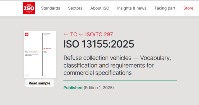2025年8月,由中國(guó)牽頭制定的《垃圾車詞匯、分類和商業(yè)規(guī)格要求》(ISO 13155:2025)國(guó)際標(biāo)準(zhǔn)正式由國(guó)際標(biāo)準(zhǔn)化組織(ISO)發(fā)布。