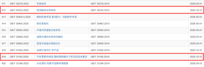 2025年10月31日,國家市場監督管理總局、國家標準化管理委員會發布2025年第29號公告,其中由全國物流標準化技術委員會提出并歸口的《物流服務合同準則》(GB/T 30333-2025)、《汽車零部件物流 塑料周轉箱尺寸系列及技術要求》(GB/T 31150-2025)、《物流單證基本要求》(GB/T 33449-20253)3項國家標準被批準發布。