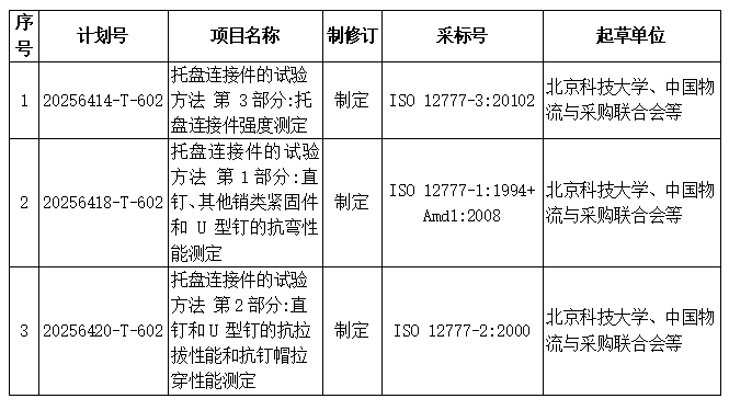 2025年12月3日,國家標準化管理委員會發(fā)布《關于下達2025年第十一批推薦性國家標準計劃及相關標準外文版計劃的通知》(國標委發(fā)〔2025〕69號),其中下達了三項托盤國家標準項目計劃。