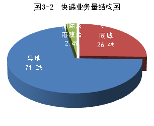 1-2月份,同城、異地、國際及港澳臺快遞業務收入分別占全部快遞收入的13.5%、56.7%和14.7%;業務量分別占全部快遞業務量的26.4%、71.2%和2.4%。與去年同期相比,同城快遞業務收入的比重上升1.5個百分點,異地快遞業務收入的比重上升1.5個百分點,國際及港澳臺業務收入的比重下降了1.8個百分點。