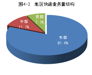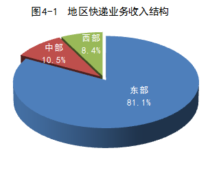 1-2月份,東、中、西部地區快遞業務收入的比重分別為81.1%、10.5%和8.4%,業務量比重分別為81%、11.7%和7.3%。與去年同期相比,東部地區快遞業務收入比重下降了1.8個百分點,快遞業務量比重下降了0.1個百分點;中部地區快遞業務收入比重上升了1.1個百分點,快遞業務量比重上升了0.6個百分點;西部地區快遞業務收入比重上升了0.7個百分點,快遞業務量比重下降了0.5個百分點。