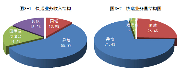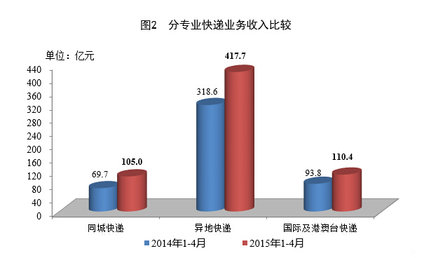 1-4月,同城、異地、國際及港澳臺快遞業務收入分別占全部快遞收入的13.9%、55.3%和14.6%;業務量分別占全部快遞業務量的26.4%、71.4%和2.2%。與去年同期相比,同城快遞業務收入的比重上升1.7個百分點,異地快遞業務收入的比重下降0.6個百分點,國際及港澳臺業務收入的比重下降了1.9個百分點。