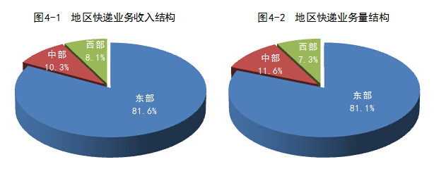 1-4月,東、中、西部地區快遞業務收入的比重分別為81.6%、10.3%和8.1%,業務量比重分別為81.1%、11.6%和7.3%。與去年同期相比,東部地區快遞業務收入比重下降了1個百分點,快遞業務量比重持平;中部地區快遞業務收入比重上升了0.7個百分點,快遞業務量比重上升了0.5個百分點;西部地區快遞業務收入比重上升了0.3個百分點,快遞業務量比重下降了0.5個百分點。