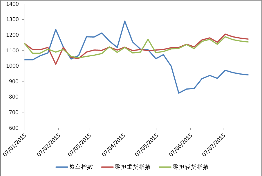 從分車型指數看,各車型指數環比均有小幅回落。整車指數為943.0點,比上周回落0.62%,比年初回落8.1%,但比5月末回升14.4%;零擔輕貨為1154.8點,比上周回落0.58%,比年初回升4.4%,比5月末回升3.7%;零擔重貨為1173.5點,比上周回落0.52%,比年初回升5.7%,比5月末回升4.8%。