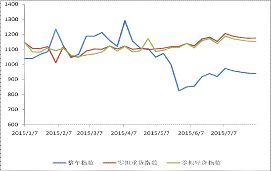 從分車型指數看,整車、零擔輕貨指數環比繼續回落,零擔重貨指數則小幅回升。整車指數為939.5點,比上周回落0.4%,比年初回落8.4%,但比5月末回升14.0%;零擔輕貨指數為1151.5點,比上周回落0.3%,比年初回升4.1%,比5月末回升3.4%;零擔重貨指數為1175.6點,比上周回升0.2%,比年初回升5.9%,比5月末回升5.0%。