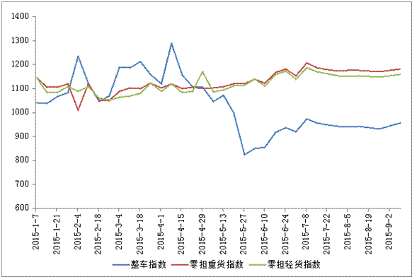 分車型指數環比均有所回升,其中整車指數為956.9 點,比上周回升0.53 %,比年初回落6.7%;零擔輕貨指數為1181.7點,比上周回升0.49 %,比年初回升6.4 %;零擔重貨指數為1158.8點,比上周回升0.48 %,比年初回升4.7 %。