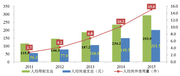2011-2015年人均用郵支出、快遞使用量和快遞支出情況