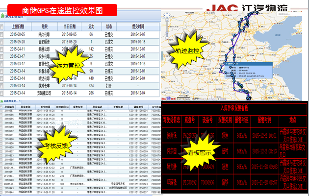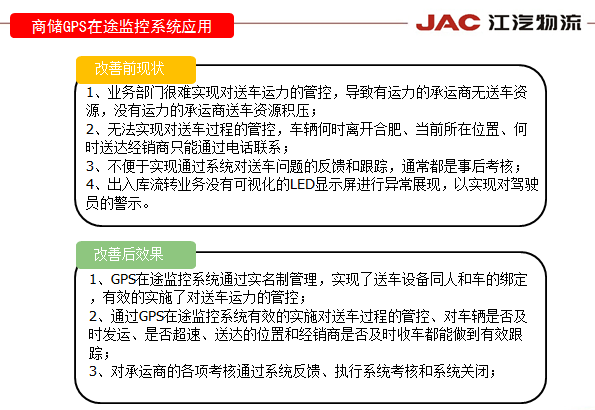 安徽江汽物流有限公司商用車GPS在途監控于2014年8月開始建設,2015年2月出入庫流轉模塊GPS在途監控正式上線,2015年4月長途發運模塊GPS在途監控正式上線,實現了信息化手段和管理機制對運輸過程的全面監控,本項目以商儲公司服務體系為契機,明確“敬客經營、服務主業”的經營意識,樹立高準時率、低質損率的服務理念,以經銷商權益保障方案為支撐,以GPS在途監控系統為主要抓手,通過系統對送車時效和送車質量考核,考核金額直接通過系統關聯至財務核算系統予以兌現。