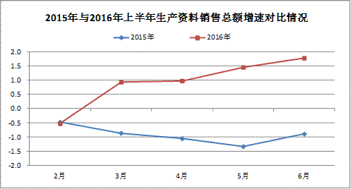 2月份,生產資料銷售總額同比下降0.5%,3月份止跌回升0.9%,隨后增速呈現逐月擴大走勢,4、5月份分別增長1.0%和1.5%。而去年上半年,各月銷售總額均呈同比下降走勢,降幅在1個百分點左右。初步預測,上半年生產資料銷售總額達到28萬億,同比增長1.8%。按可比價格計算,比去年同期增長6.4%,增速較1-5月有所加快。