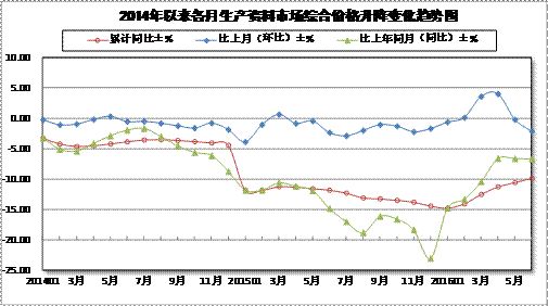 2016年6月,經濟運行繼續保持平穩。從上半年整體情況來看,我國經濟運行總體呈現緩中趨穩走勢,雖然上行仍需動力,但下行空間已經明顯縮窄。生產資料市場總體運行良好,但需求低迷、產能過剩等問題仍然存在。在此背景下,6月份生產資料市場平均價格環比小幅回落2.12%,降幅較上月擴大1.91個百分點;同比下降6.67%。