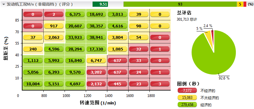 將車輛盡量保持在高擋位,也是讓車輛達到最佳經濟性的方法之一。從上表可以看出,先比1月份,該車輛3月份擋位配合得更好,最高擋行駛占比更大。