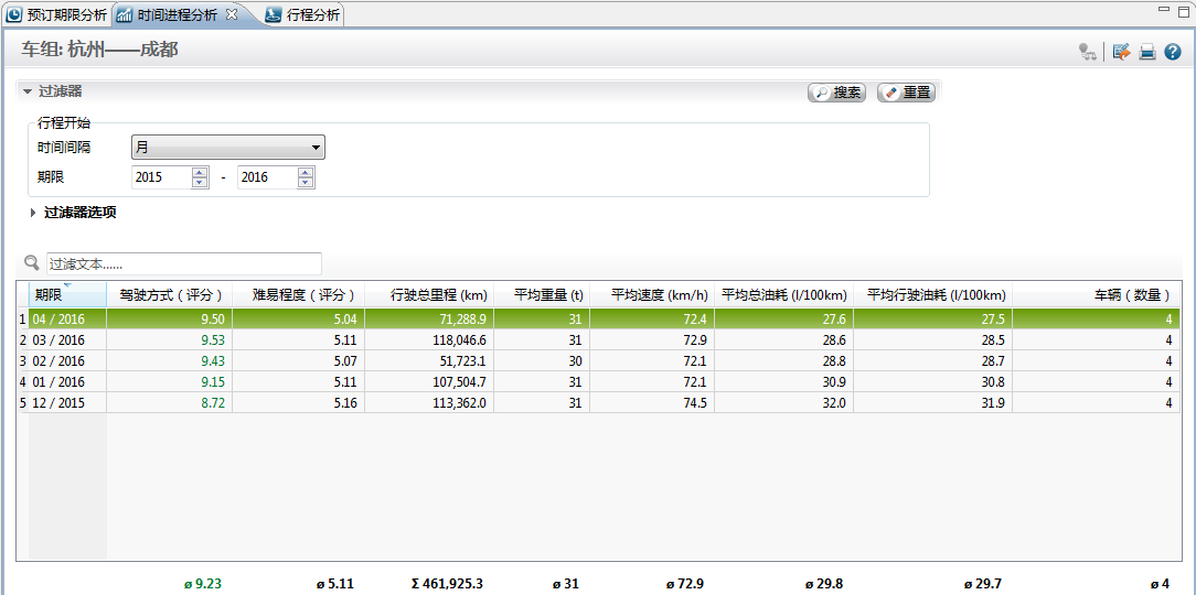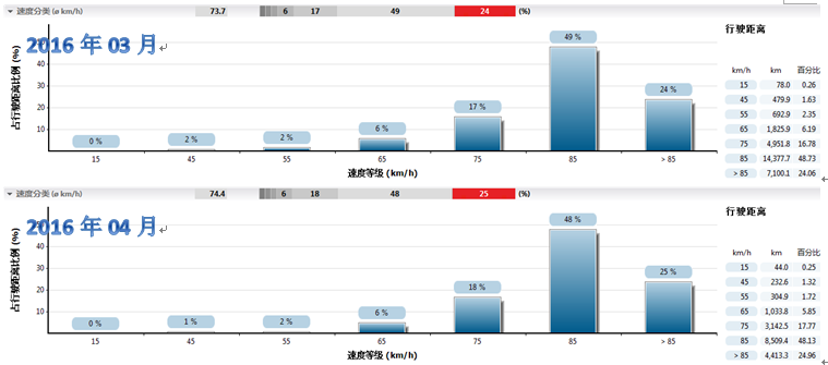 經過培訓和駕駛員自身的實踐,從2016年3月開始,駕駛員已經能夠長時間將車速控制在經濟車速區域,幾乎占據整個運營里程的一半。而從之前的數據表中,我們看到實際上車輛全程的平均速度并沒有產生明顯的變化,也就是說,在時效未受影響的前提下,就車速這一指標,車輛以更經濟的狀態在運行。