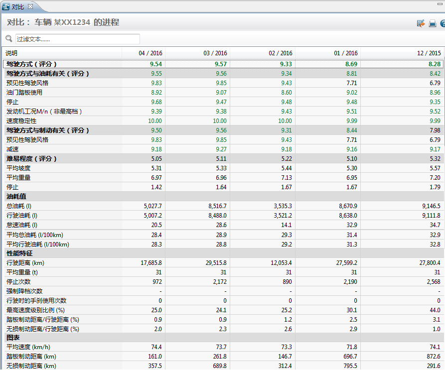 可以看出,在車隊平均重量、平均速度基本保持不變的情況下,車隊4臺車平均駕駛得分穩步上升,從8.7分提升至穩定在9.5分;車隊平均油耗逐月下降,從接近32L/100km,下降至27.5L/100km,平均油耗下降4.5L,降幅達13.7%。