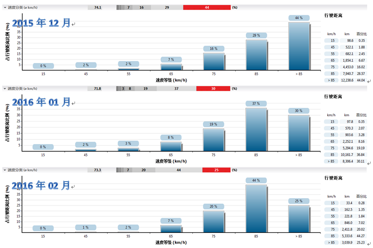 從上述連續5個月的速度分類對比圖可以看出,2015年12月該車輛44%的路程行駛速度大于85km/h,而奔馳車輛的最佳經濟時速在75-85km/h之間(即85柱狀圖下)。