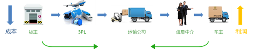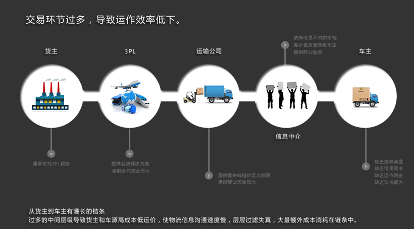 在物流供應鏈條中,大貨主會選擇像寶供這樣的第三方為他們服務,中小型企業則直接找運輸公司。然而,最高效率的交易應該是,貨主與車主直接交易。但是因為個體戶在中國行業背景下缺乏信用背書,沒有辦法直接承運一手貨源,于是市場中形成了從貨源到車源的漫長交易鏈條,運單層層轉包,信息層層過濾,大量成本消耗在車貨匹配環節,肥了中間商,苦了貨主和車主。