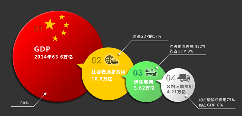 中國物流的效率相對于世界平均水平,差距仍然很大。2014年,中國社會物流總費用10.8萬億,約占GDP總值的17%;運輸總費用5.62萬億,約占物流總費用52%、約占GDP總值8%;其中的公路運輸費用4.21萬億,約占運輸總費用75%、占GDP總值6%。從國內物流費用結構里可看到,占比最大的物流費用是運輸費用,特別是公路運輸費用。而在美國,整個物流費用占GDP總值的8.3%,相比之下,中國光是公路運輸就占6%。長期粗放式發展,使得中國物流行業處于“臟、小、亂、差”的現狀中,整體效率有待提升。
