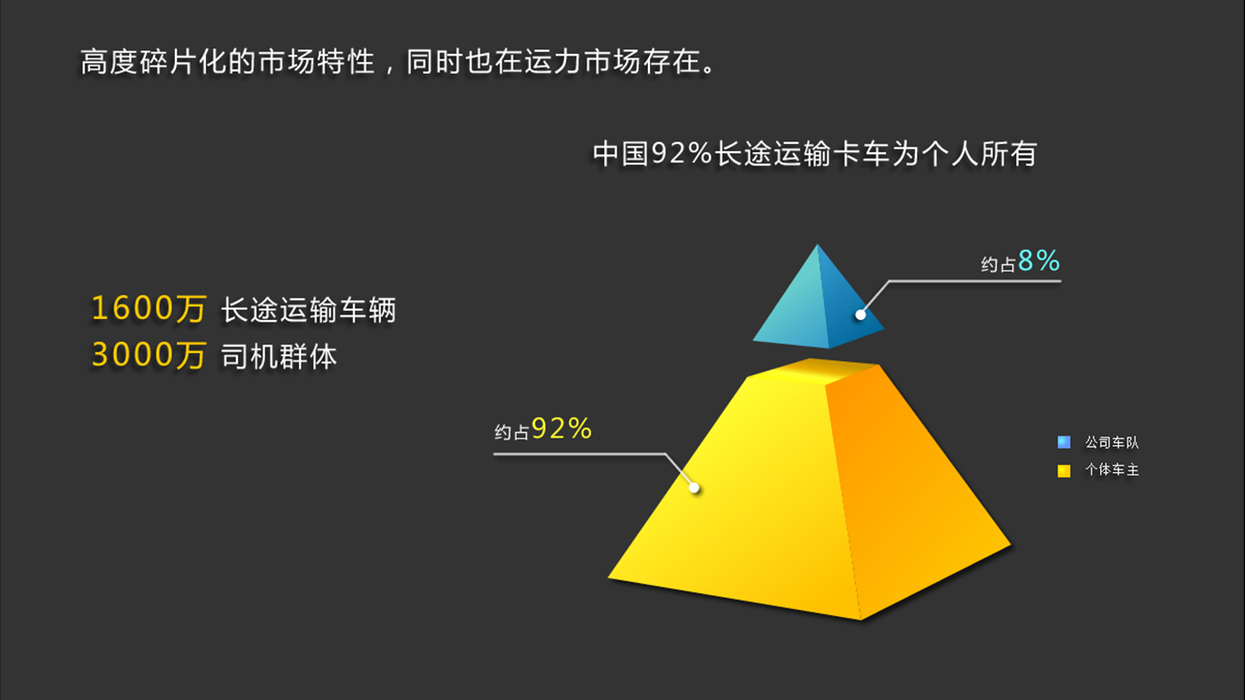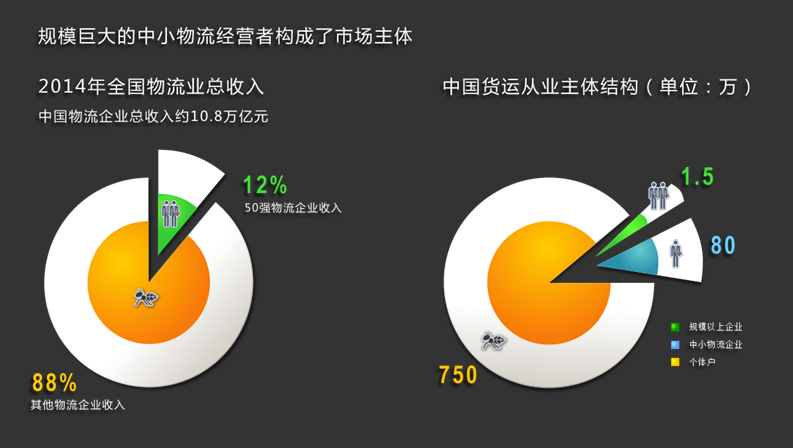 中國物流市場高度碎片化,很難形成集約優勢。在中國,近80萬戶中小物流企業和近800萬物流個體從業者,承擔了超過80%的市場份額。而運力市場同樣呈現高度碎片化,在承運端平均每個業主擁有的汽車量,不到1.7輛,目前全國有1600多萬輛長途貨車,92%為個體戶所有。這種車源、貨源兩端高度碎片化的分布狀況,使得市場建立透明對等信用體系十分困難。