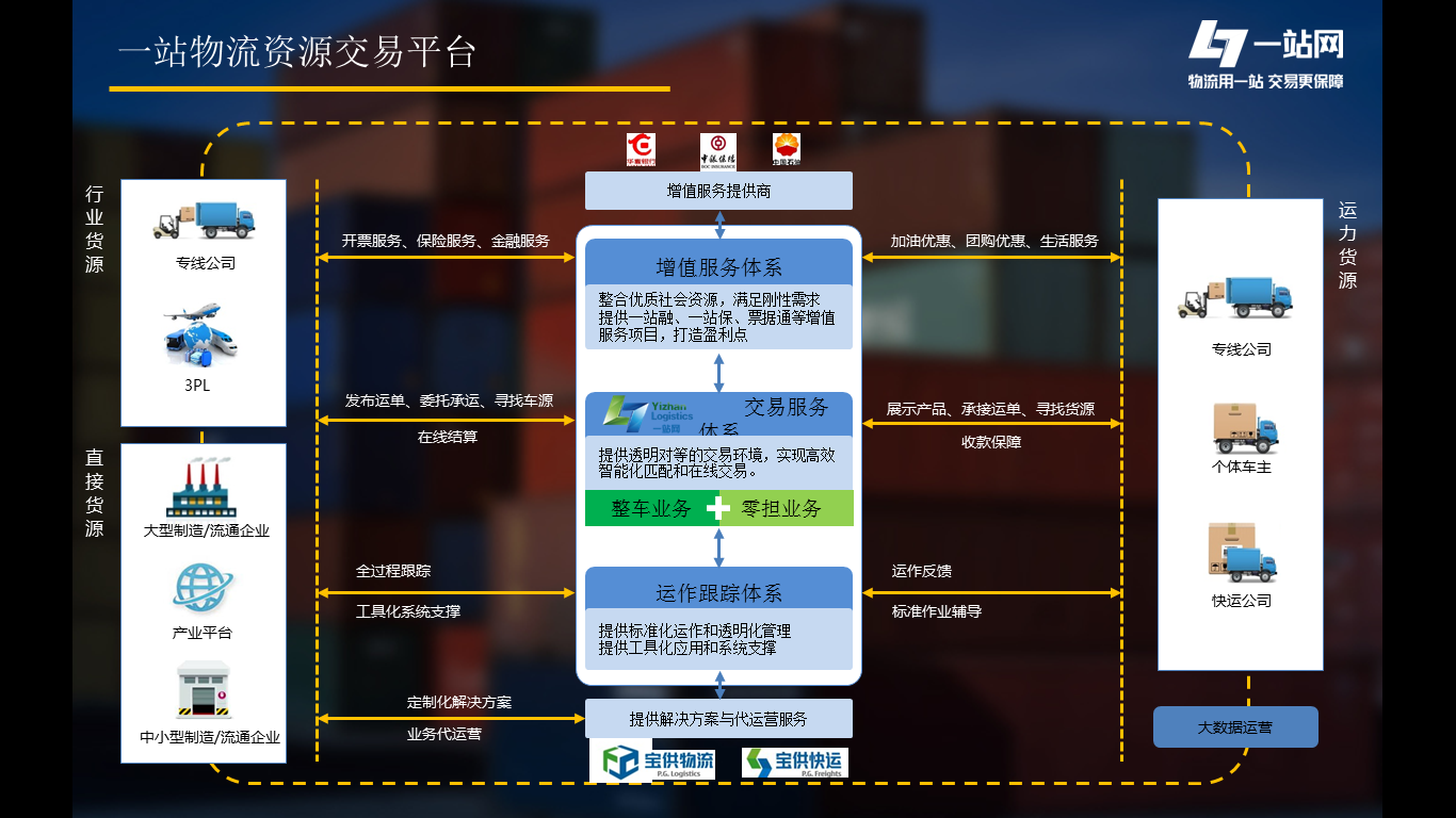 一站物流資源交易平臺專注打造一站式交易服務鏈條,通過建立標準、優化流程、信息驗證、信用管控、O2O服務網絡支撐,為貨、車雙方提供透明對等的交易環境和高效可靠的交易服務,并通過全程線上線下服務解決雙方后顧之憂,使雙方優化成本,實現交易價值最大化。