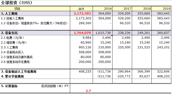 該項目實施之前主要采用人工打單、揀貨作業(yè),正常訂單量每天需要4名工人進行單據(jù)打印,11名員工進行訂單拆零揀貨作業(yè),高峰期間加班情況比較嚴重。項目投入使用后,單據(jù)、系統(tǒng)操作人員調(diào)整到1名,揀貨人員調(diào)整到5名,每小時揀貨數(shù)量可高達400箱,約270張訂單;揀貨效率提高50%;單從訂單揀選環(huán)節(jié)的經(jīng)濟效益分析來看,該項目就具備較好的經(jīng)濟效益,見下表:
