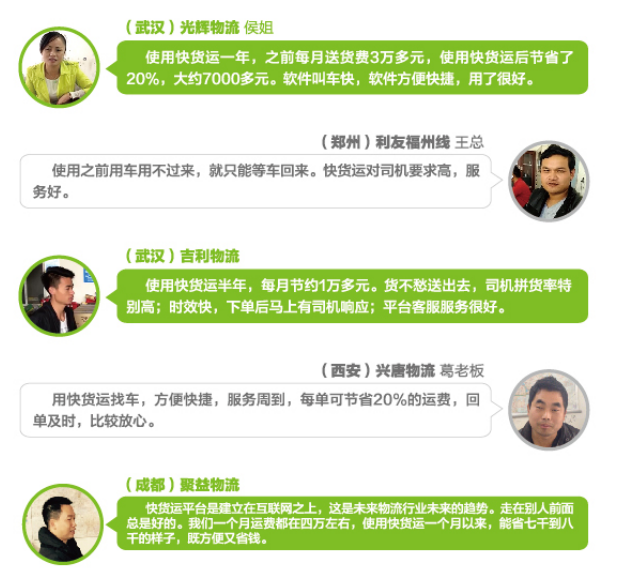 3、同時,快貨運平臺還帶來了極大的社會價值。在2015年8月,快貨運平臺僅為武漢一個城市就減少無效進城貨車約12000車次,單月減少碳排放約2600噸,減少了大貨車無效進城和空駛帶來的路面損傷、交通擁堵及尾氣排放。快貨運的城市貨運大數據能為交通管理和運輸管理部門提供良好的參考。快貨運平臺形成“運力池”還能為城市重大事故和災難提供應急運力。