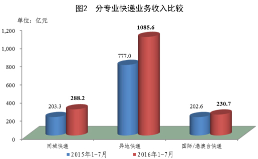 1-7月份,全國快遞服務企業業務量累計完成157.5億件,同比增長55.9%;業務收入累計完成2026億元,同比增長42.9%。其中,同城業務收入累計完成288.2億元,同比增長41.8%;異地業務收入累計完成1085.6億元,同比增長39.7%;國際/港澳臺業務收入累計完成230.7億元,同比增長13.8%。
