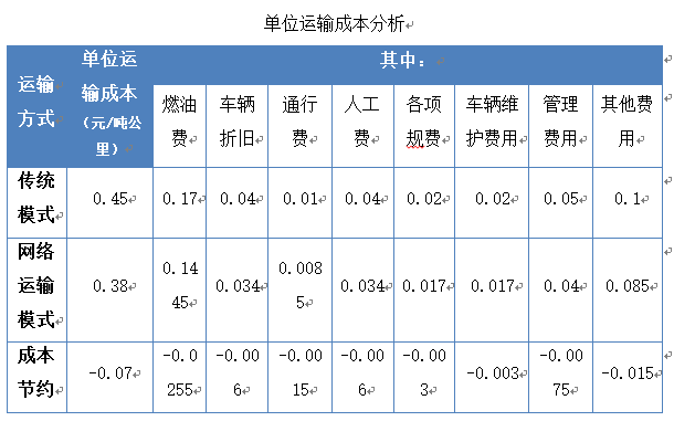 運(yùn)輸成本對(duì)比分析指在完成相同周轉(zhuǎn)量下的單位運(yùn)輸成本進(jìn)行對(duì)比分析,包括總的成本和各項(xiàng)成本費(fèi)用結(jié)構(gòu)(燃油、車(chē)輛折舊、保險(xiǎn)等)對(duì)比。