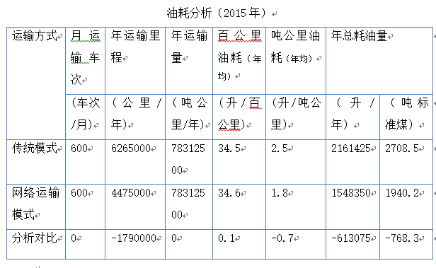 能源(0#柴油)消耗分析:根據(jù)項(xiàng)目實(shí)施后的預(yù)期目標(biāo),牽引車(chē)40%返程是重載,60%則僅牽引車(chē)返回(減少60%的無(wú)效運(yùn)輸),對(duì)于完成試點(diǎn)網(wǎng)絡(luò)化運(yùn)輸項(xiàng)目,企業(yè)采用傳統(tǒng)運(yùn)輸模式和零擔(dān)危險(xiǎn)品網(wǎng)絡(luò)化運(yùn)輸項(xiàng)目所產(chǎn)生的能源消耗加以分析對(duì)比,對(duì)項(xiàng)目采用零擔(dān)危險(xiǎn)品網(wǎng)絡(luò)化運(yùn)輸項(xiàng)目模式所產(chǎn)生燃油節(jié)約進(jìn)行系統(tǒng)測(cè)算,并換算成標(biāo)準(zhǔn)煤量