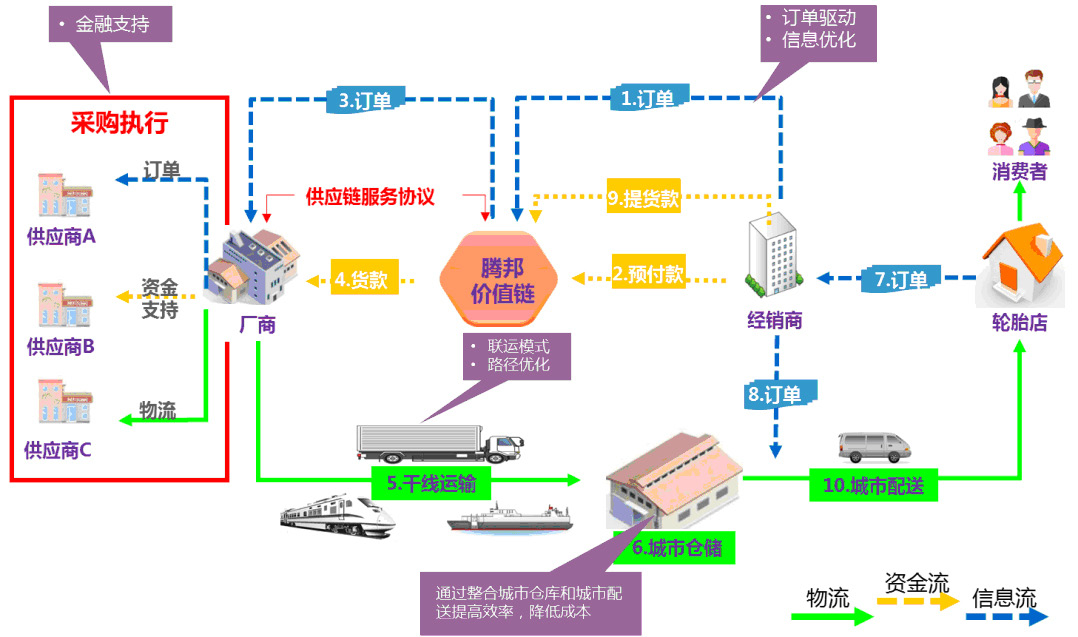 供應鏈作為騰邦集團全產(chǎn)業(yè)生態(tài)鏈的一份子,不僅提供倉儲、運輸?shù)然A物流服務,同時針對經(jīng)營中的實際問題量身定制整體供應鏈解決方案,借助互聯(lián)網(wǎng)平臺,基于騰邦現(xiàn)有金融資源,打造供應鏈金融服務平臺,實現(xiàn)上下游企業(yè)間商流、物流、信息流和資金流的有效融合,使供應鏈整體價值得以提升。