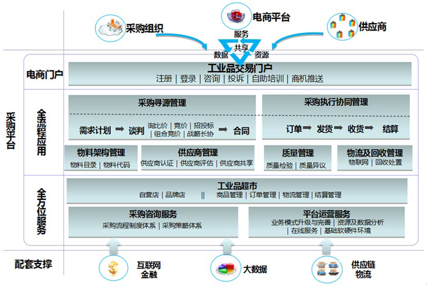 企業“互聯網+采購”也是各級政府大力倡導的發展方向。“十三五”規劃指出:“拓展網絡經濟空間。實施‘互聯網+’行動計劃,發展物聯網技術和應用,發展分享經濟,促進互聯網和經濟社會融合發展。..推進產業組織、商業模式、供應鏈、物流鏈創新,支持基于互聯網的各類創新。”“構建產業新體系。加快建設制造強國,實施《中國制造二○二五》..促進信息技術向市場、設計、生產等環節滲透,推動生產方式向柔性、智能、精細轉變。”各級地方政府貫徹落實國務院《關于積極推進“互聯網+”行動的指導意見》,制定適合本地的“互聯網+”行動落實方案,推動電子商務、供應鏈等關于互聯網與傳統產業深度融合,加速經濟轉型升級。